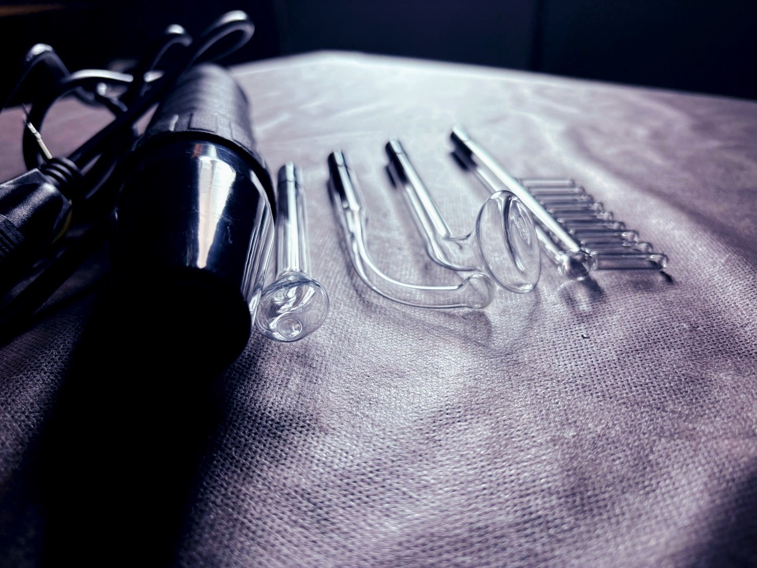 ガラス電極に通電すると、内部に紫(バイオレット系)の放電が見えるタイプがあり、光の演出が強烈。暗い部屋で使えば視覚的な演出効果が非常に高い。これが「見られて支配されている」感を強めることができます。