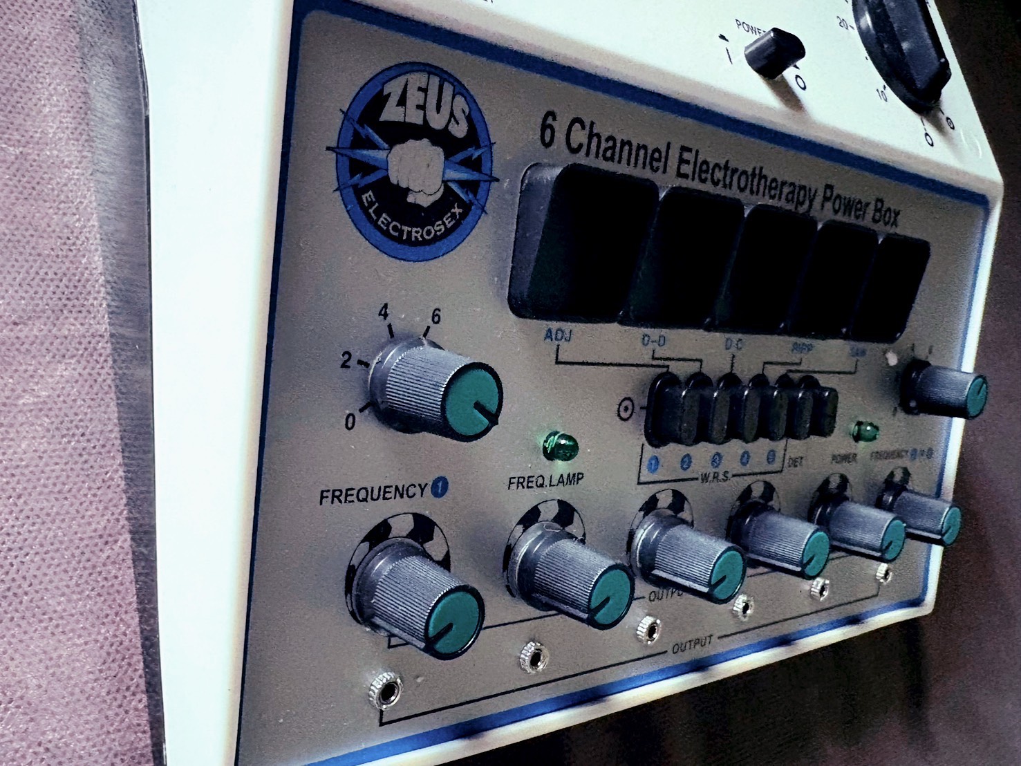 SMプレイの中でもエレクトロプレイ(電気刺激プレイ)**に使われる高度な装置です。複数の電極やパッドを使用し、6つの独立した出力(チャンネル)で身体の異なる部位に電気刺激を与えることが可能。